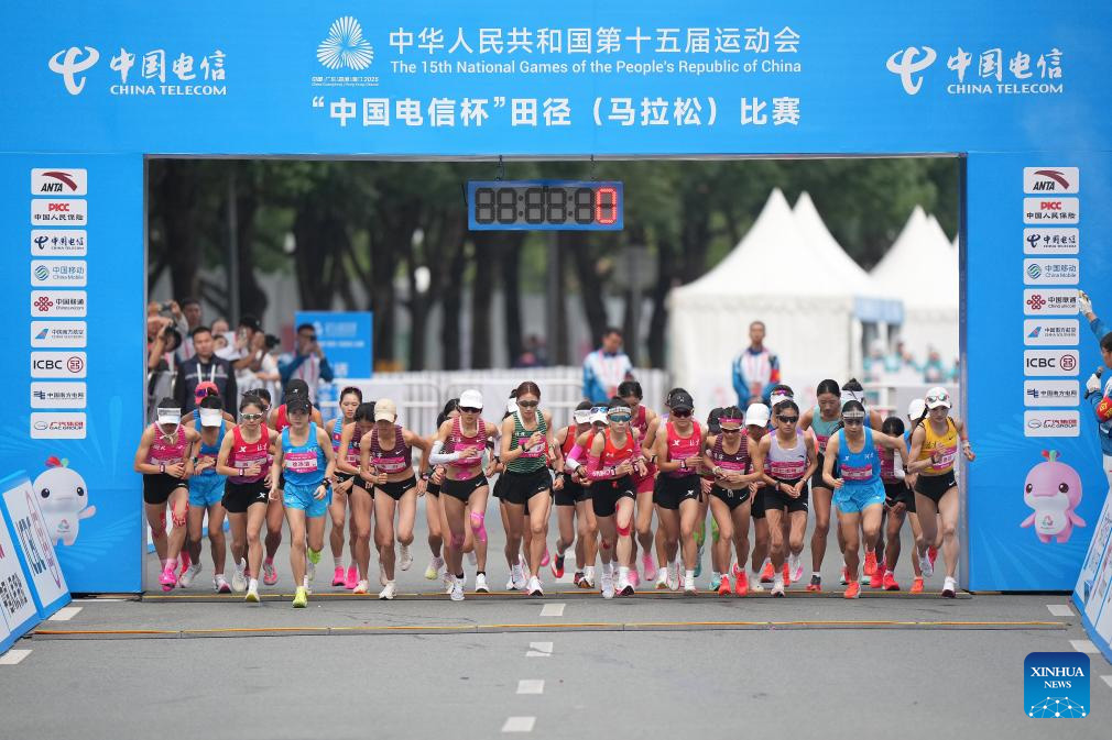 Athletes start during the women's marathon event at China's 15th National Games in Shenzhen, south China's Guangdong Province, Nov. 15, 2025. (Xinhua/Jiang Han)