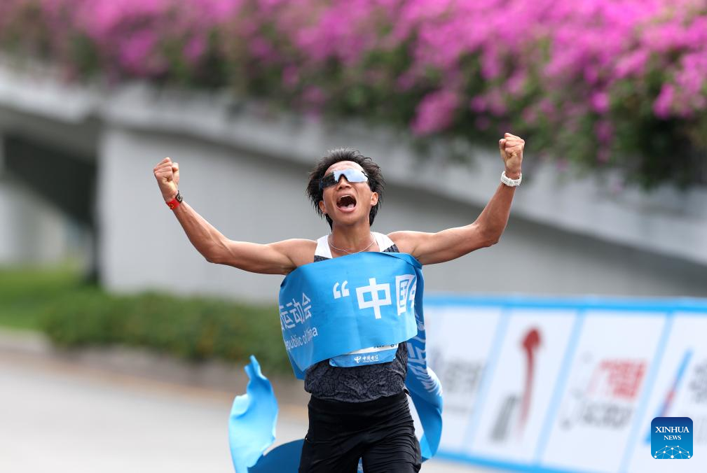 He Jie of Ningxia crosses the finish line during the men's marathon event at China's 15th National Games in Shenzhen, south China's Guangdong Province, Nov. 15, 2025. (Xinhua/Ding Ting)