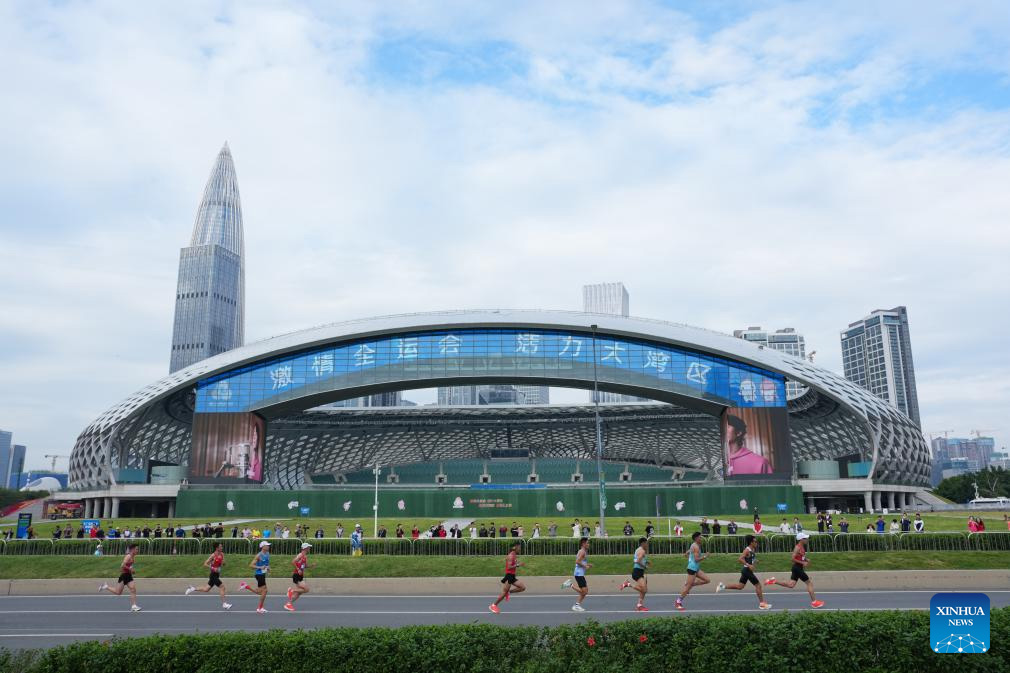 Athletes compete during the men's marathon event at China's 15th National Games in Shenzhen, south China's Guangdong Province, Nov. 15, 2025. (Xinhua/Jiang Han)