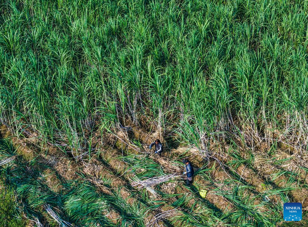 A drone photo shows workers harvesting sugarcane in Yiwu City, east China's Zhejiang Province, Nov. 15, 2025. (Xinhua/Xu Yu)