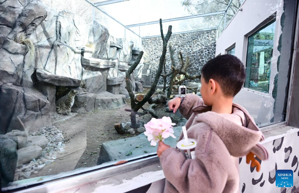 A child takes photos of a snow leopard at Xining Wildlife Park in northwest China's Qinghai Province, Nov. 15, 2025. The leopard house at Xining Wildlife Park reopened to the public after a month-long renovation. (Xinhua/Qi Zhiyue)