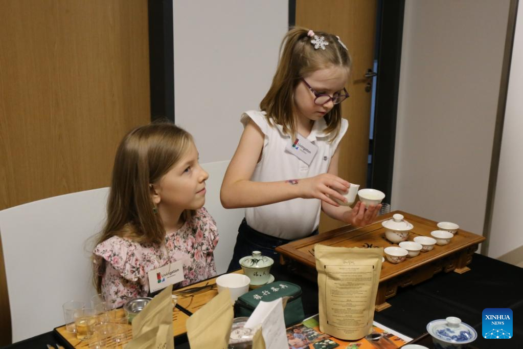 Children try Chinese tea ceremony during the 2025 Euro Tea Expo held in Prague, the Czech Republic, Nov. 15, 2025. (Photo by Helena Kocova/Xinhua)