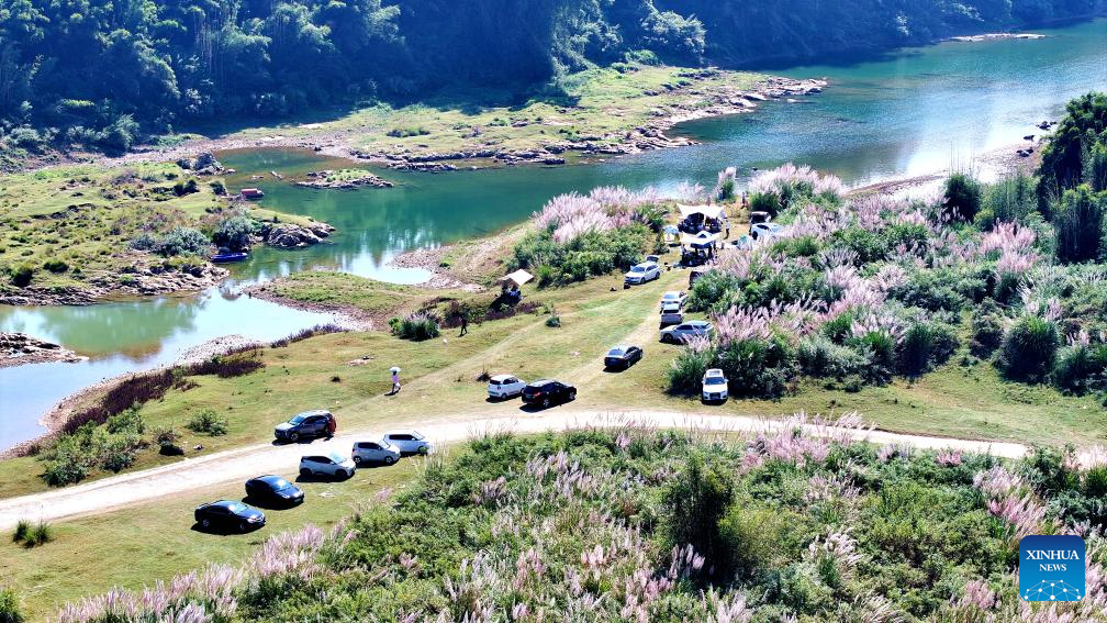 An aerial drone photo taken on Nov. 16, 2025 shows tourists having fun by the Rongjiang River in Liucheng County of Liuzhou City, south China's Guangxi Zhuang Autonomous Region. (Photo by Tang Xiaokui/Xinhua)