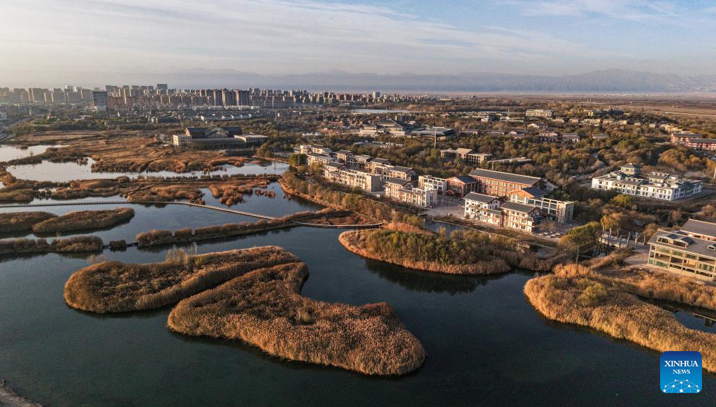 An aerial drone photo taken on Nov. 16, 2025 shows the scenery of the Zhangye National Wetland Park in Zhangye City, northwest China's Gansu Province. (Photo by Chen Li/Xinhua)