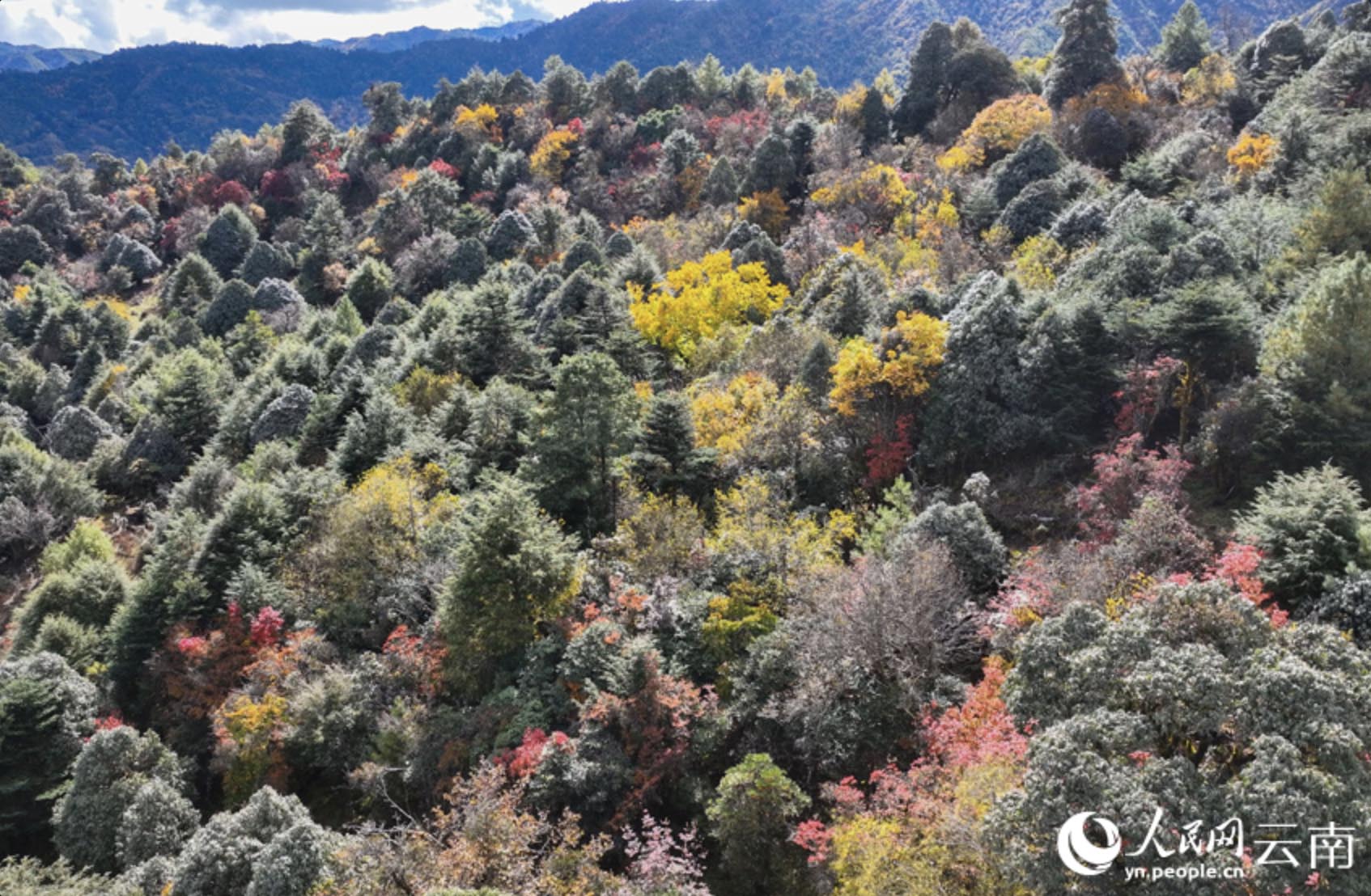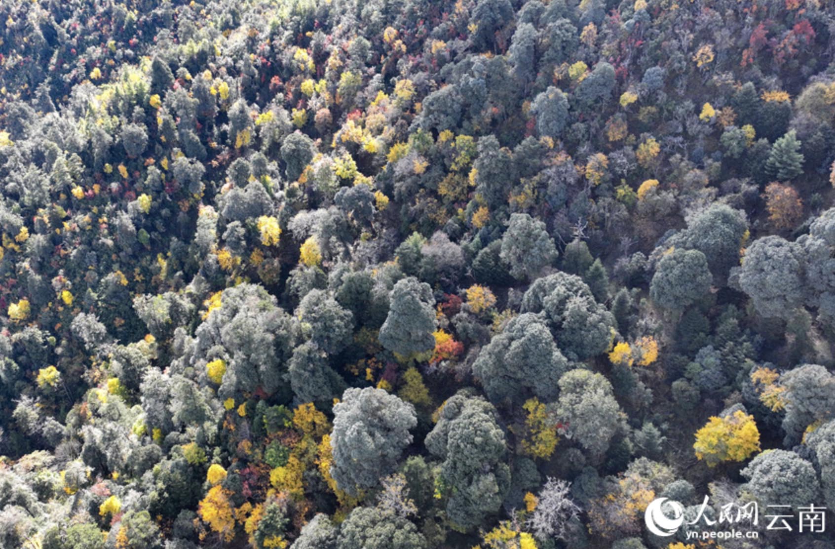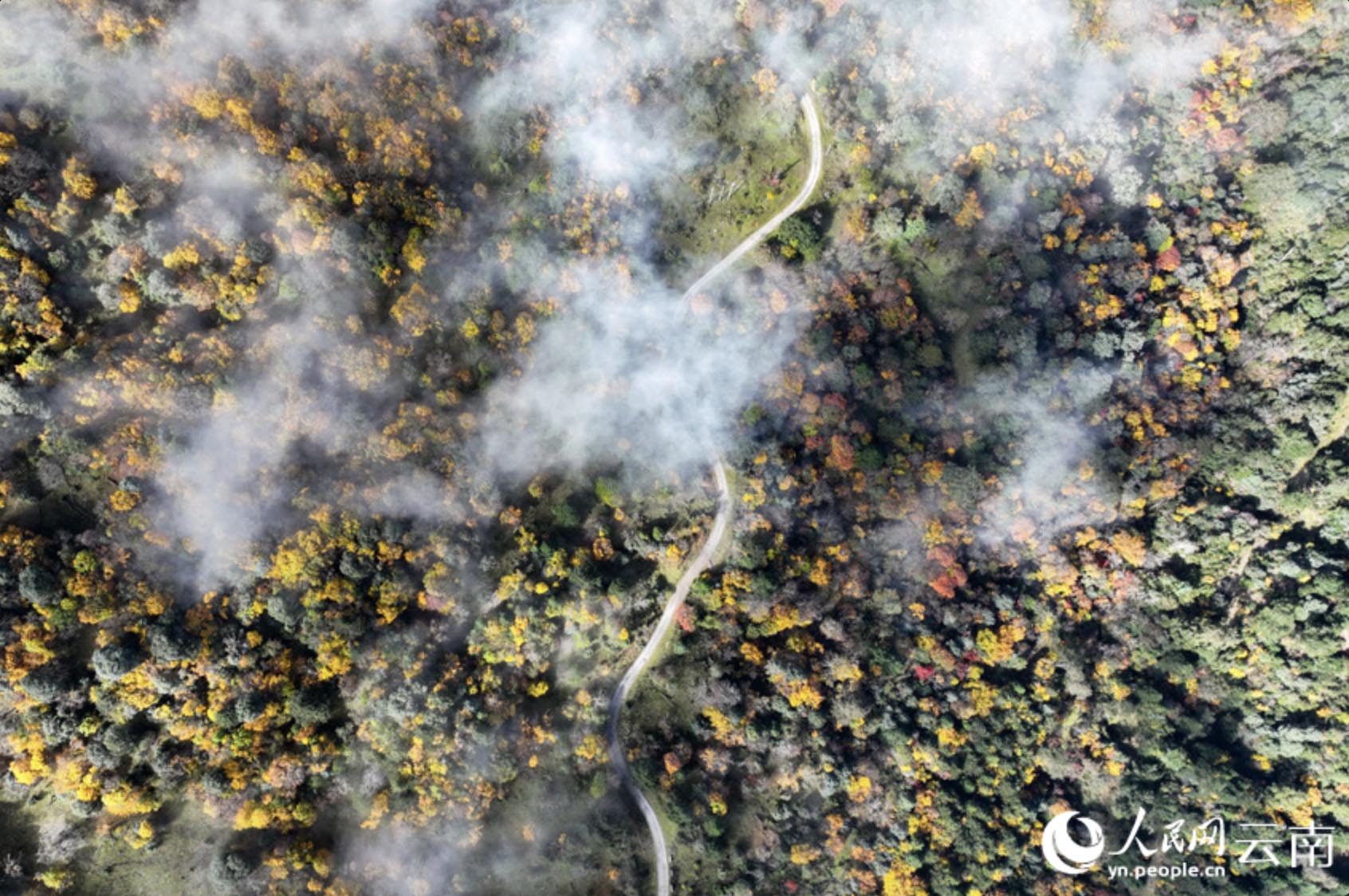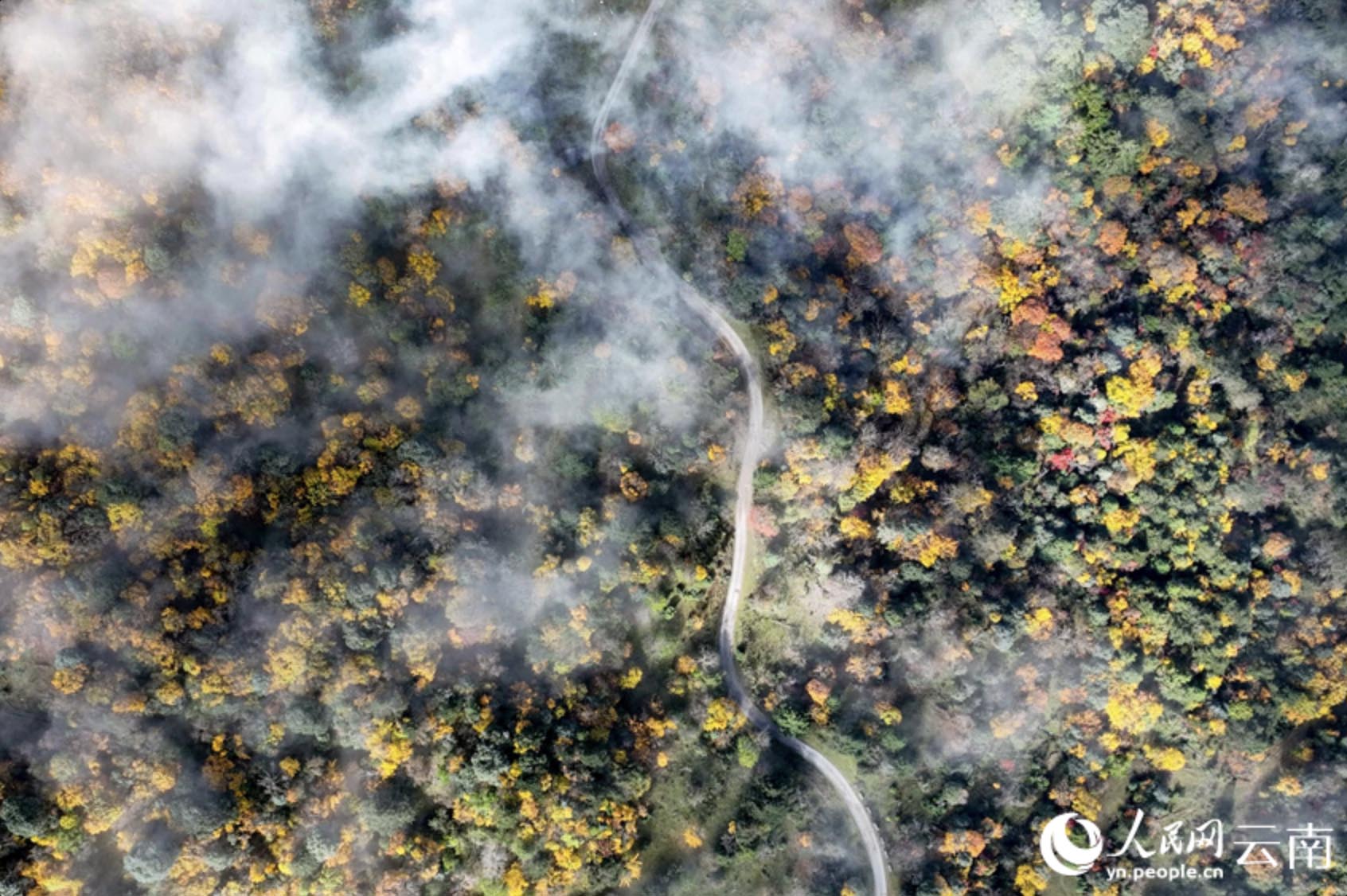 As early winter settles in, a beautiful landscape unfolds in Jianchuan county, Dali, southwest China's Yunnan Province. Aerial views reveal rolling hills bathed in a sea of morning mist and forests draped in rich autumn hues stretching into the distance. From deep evergreen to warm gold, the woodlands unfold like a watercolor painting, showcasing nature's serene beauty in western Yunnan.