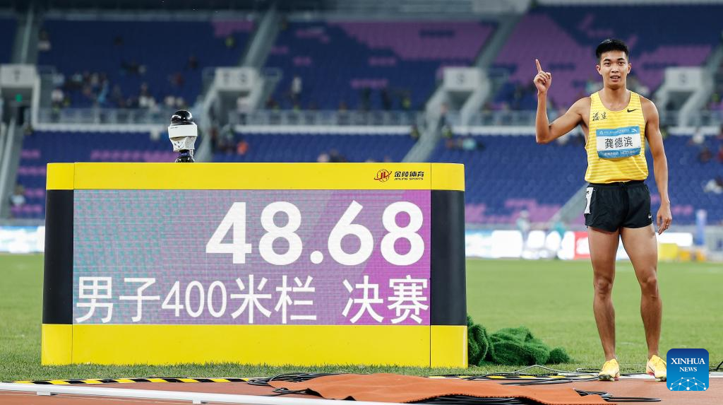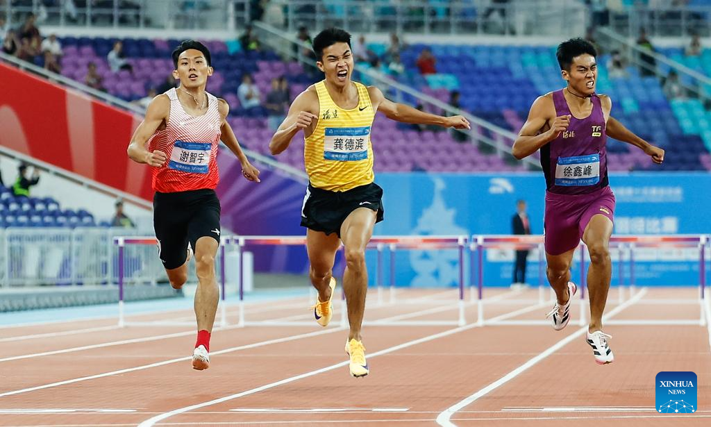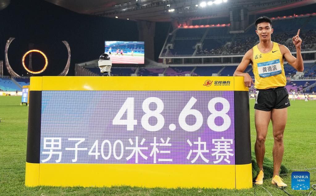 Gong Debin of Fujian celebrates after the men's 400m hurdles final of athletics in Guangzhou, south China's Guangdong Province, Nov. 17, 2025. (Xinhua/Huang Wei)