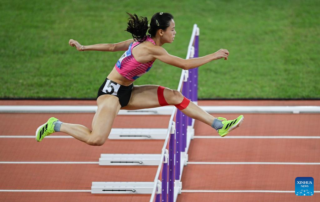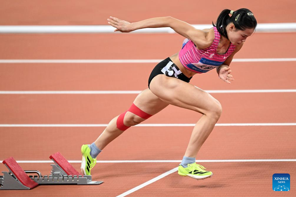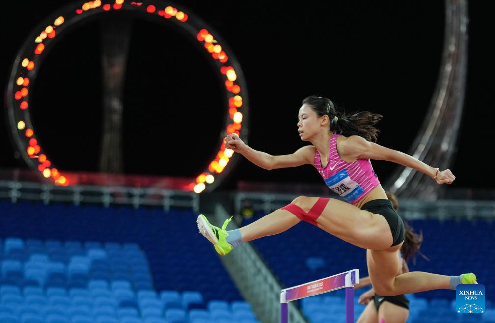 Mo Jiadie of Guangdong competes during the women's 400m hurdles final of athletics at China's 15th National Games in Guangzhou, south China's Guangdong Province, Nov. 17, 2025. (Xinhua/Deng Hua)