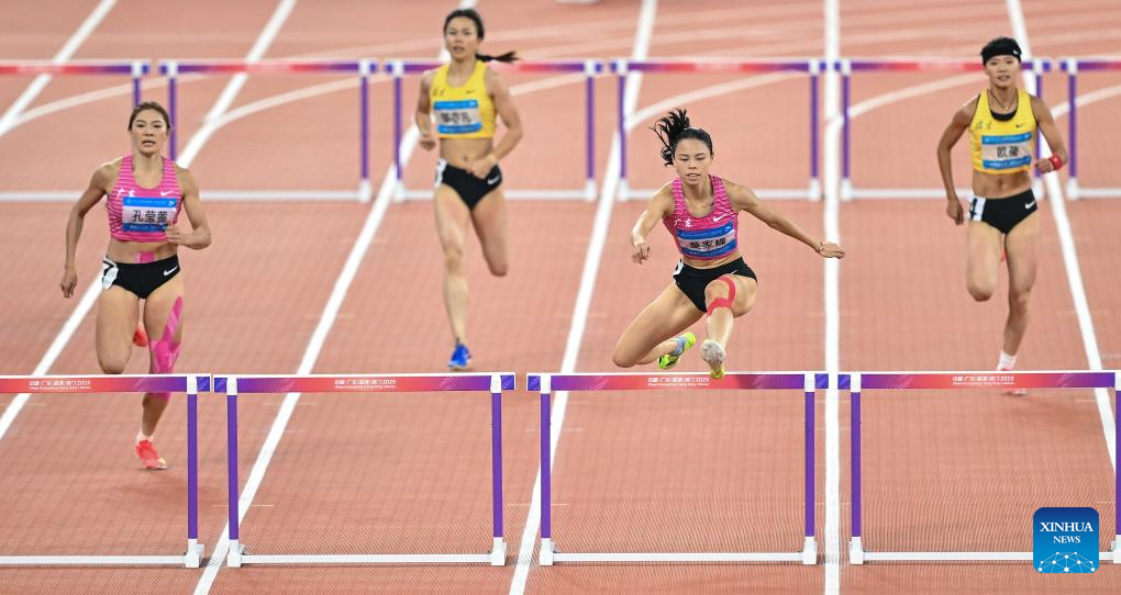 Mo Jiadie (2nd L) of Guangdong competes during the women's 400m hurdles final of athletics at China's 15th National Games in Guangzhou, south China's Guangdong Province, Nov. 17, 2025. (Xinhua/Huang Wei)