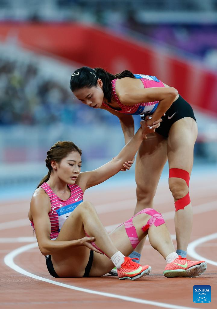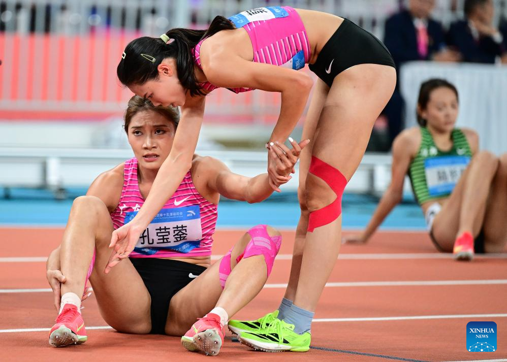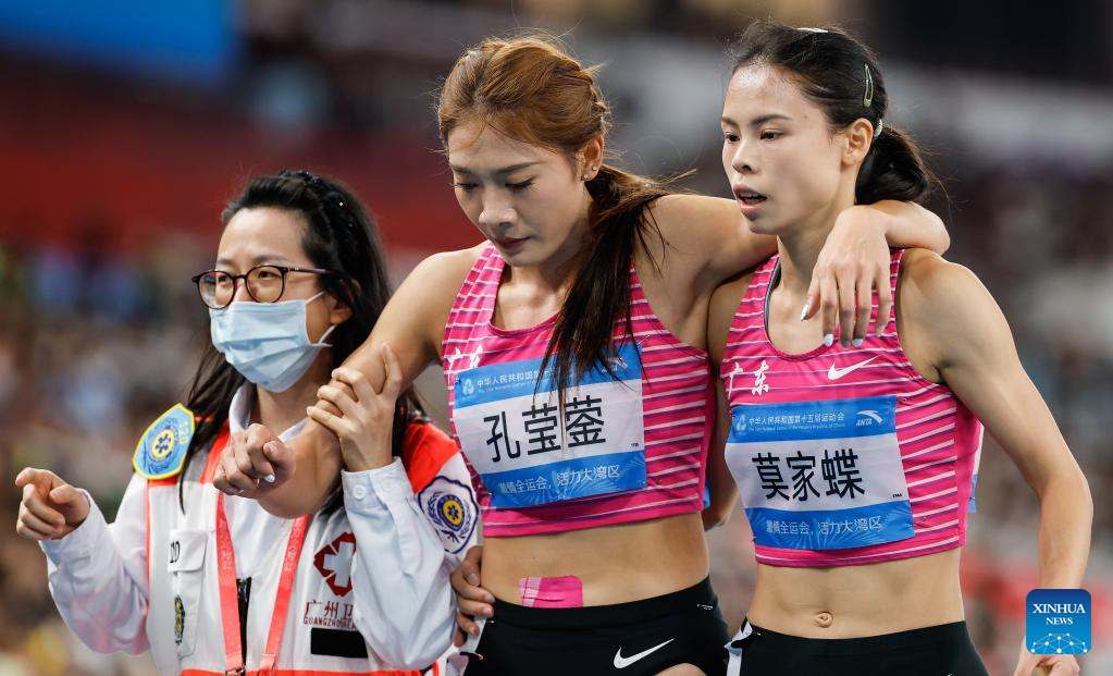 Mo Jiadie (R) of Guangdong helps her teammate Kong Yingying after the women's 400m hurdles final of athletics at China's 15th National Games in Guangzhou, south China's Guangdong Province, Nov. 17, 2025. (Xinhua/Jiang Han)