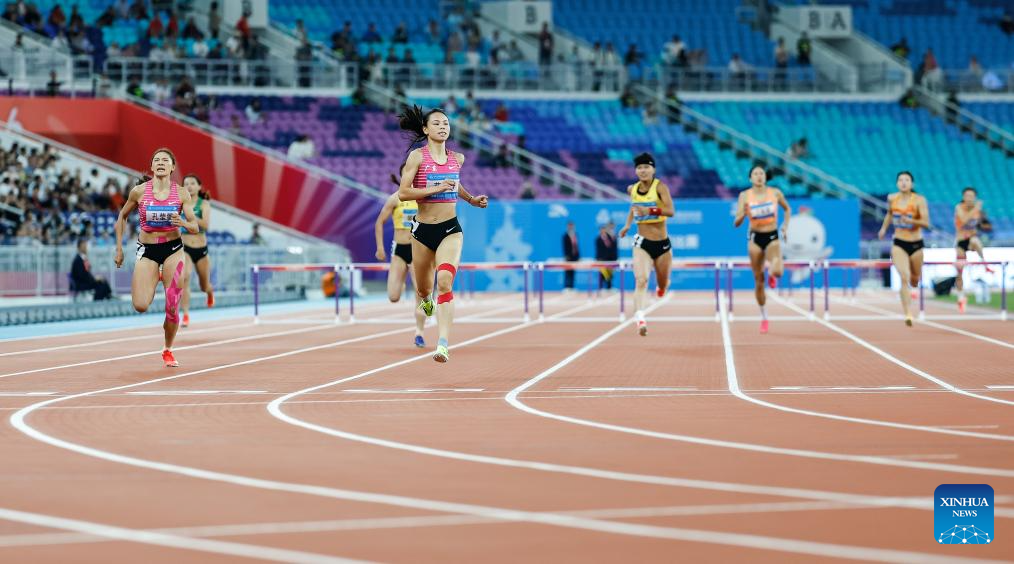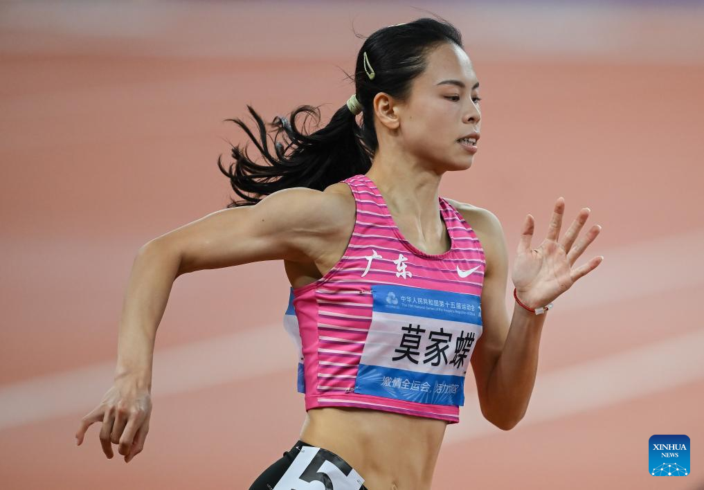 Mo Jiadie of Guangdong competes during the women's 400m hurdles final of athletics at China's 15th National Games in Guangzhou, south China's Guangdong Province, Nov. 17, 2025. (Xinhua/Xiao Yijiu)