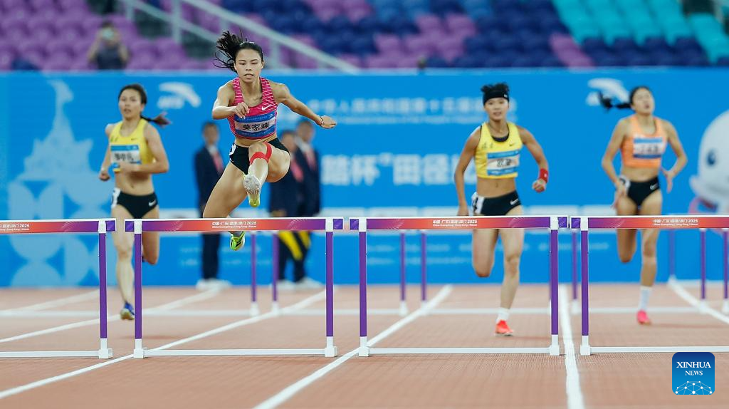 Mo Jiadie of Guangdong competes during the women's 400m hurdles final of athletics at China's 15th National Games in Guangzhou, south China's Guangdong Province, Nov. 17, 2025. (Xinhua/Jiang Han)