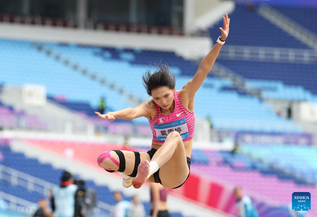 Huang Wenting of Guangdong competes during the women's heptathlon long jump of athletics at China's 15th National Games in Guangzhou, south China's Guangdong Province, Nov. 19, 2025. (Xinhua/Jiang Han)