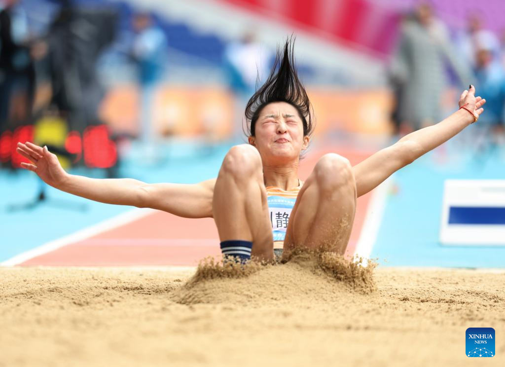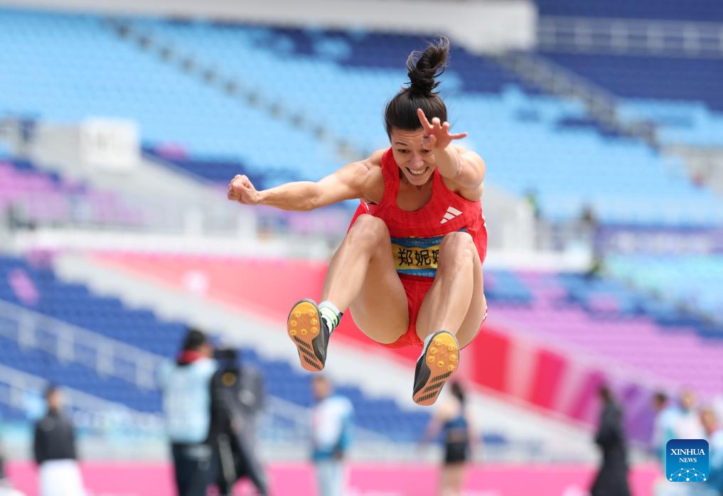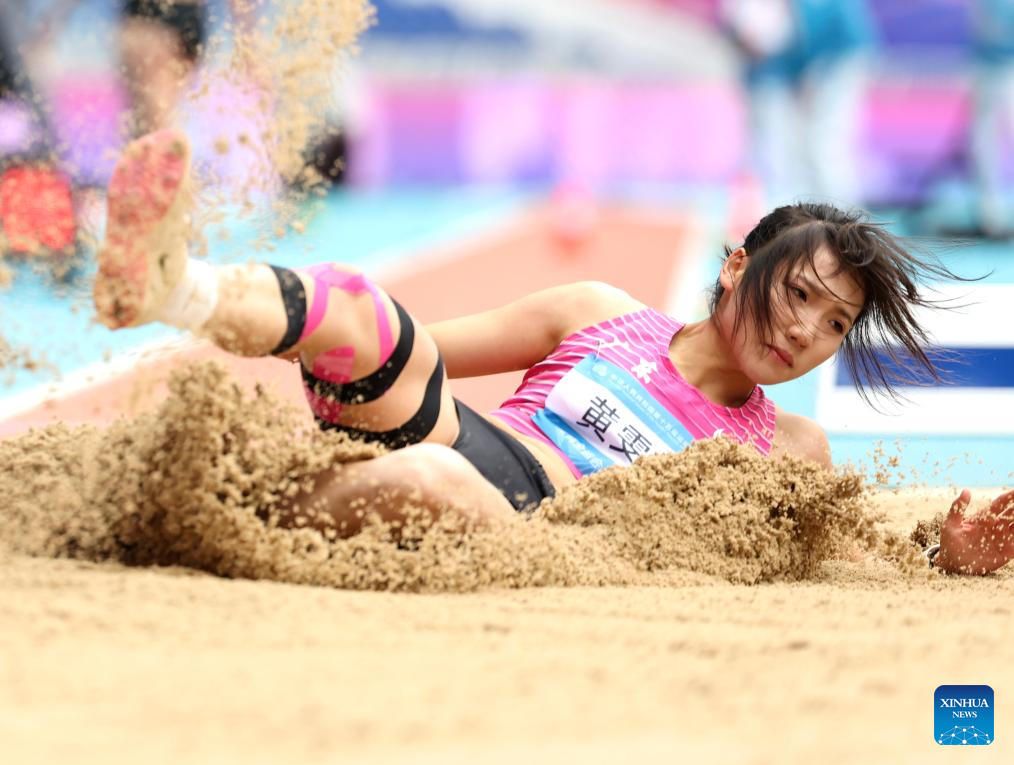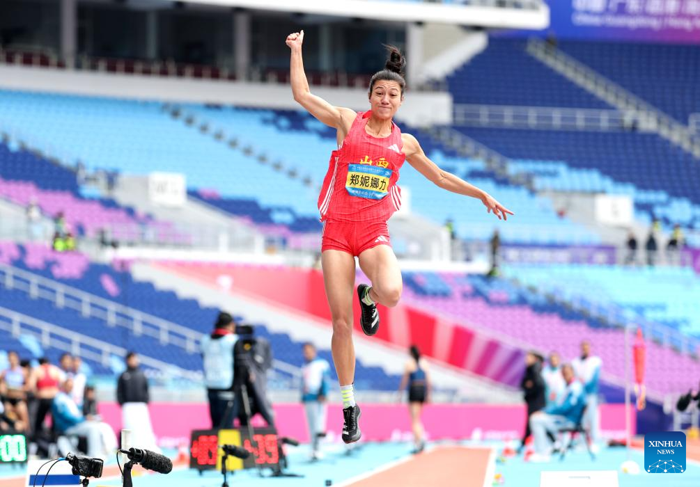 Zheng Ninali of Shanxi competes during the women's heptathlon long jump of athletics at China's 15th National Games in Guangzhou, south China's Guangdong Province, Nov. 19, 2025. (Xinhua/Jiang Han)