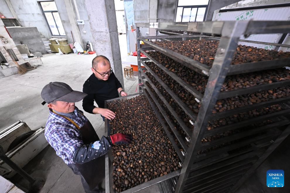 Staff members check dried fruits of oil-tea camellia at a workshop in Lianshan Village of Yongtai County, Fuzhou City, southeast China's Fujian Province, Nov. 18, 2025. Fruits of oil-tea camellia cultivated in Yongtai County have recently entered the harvest season. As a major oil-tea camellia planting county in Fujian, Yongtai devotes a total of 137,500 mu (about 9,167 hectares) of its arable lands to this industrial crop. (Xinhua/Jiang Kehong)