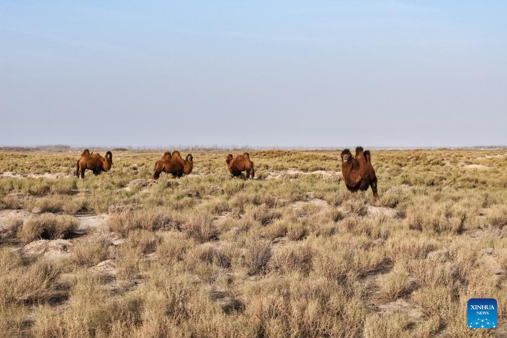 A drone photo taken on Nov. 18, 2025 shows a herd of camels foraging outside the ruins of Suoyang City in Guazhou County, Jiuquan City, northwest China's Gansu Province. (Xinhua/Lang Bingbing)