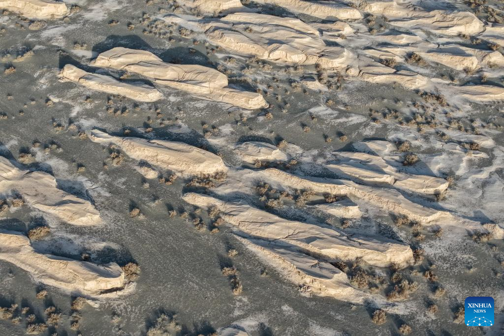 An aerial drone photo taken on Nov. 18, 2025 shows the remains of an irrigation canal system in Guazhou County, Jiuquan City, northwest China's Gansu Province. (Xinhua/Lang Bingbing)