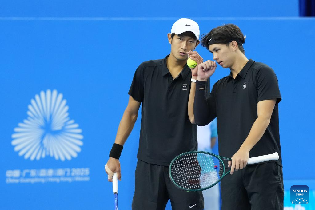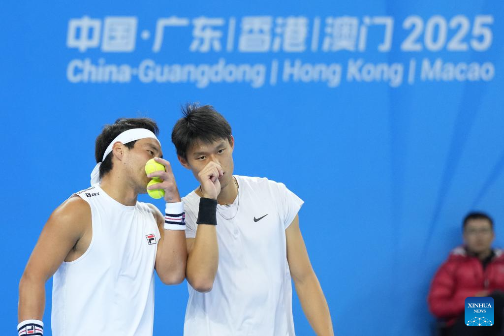 Bu Yunchaokete (L)/Zheng Zhan are seen during the tennis men's doubles final between Tang Sheng/Sun Qian of Jiangsu and Bu Yunchaokete/Zheng Zhan of Zhejiang at China's 15th National Games in Hengqin, south China's Guangdong Province, Nov. 19, 2025. (Xinhua/Yan Linyun)