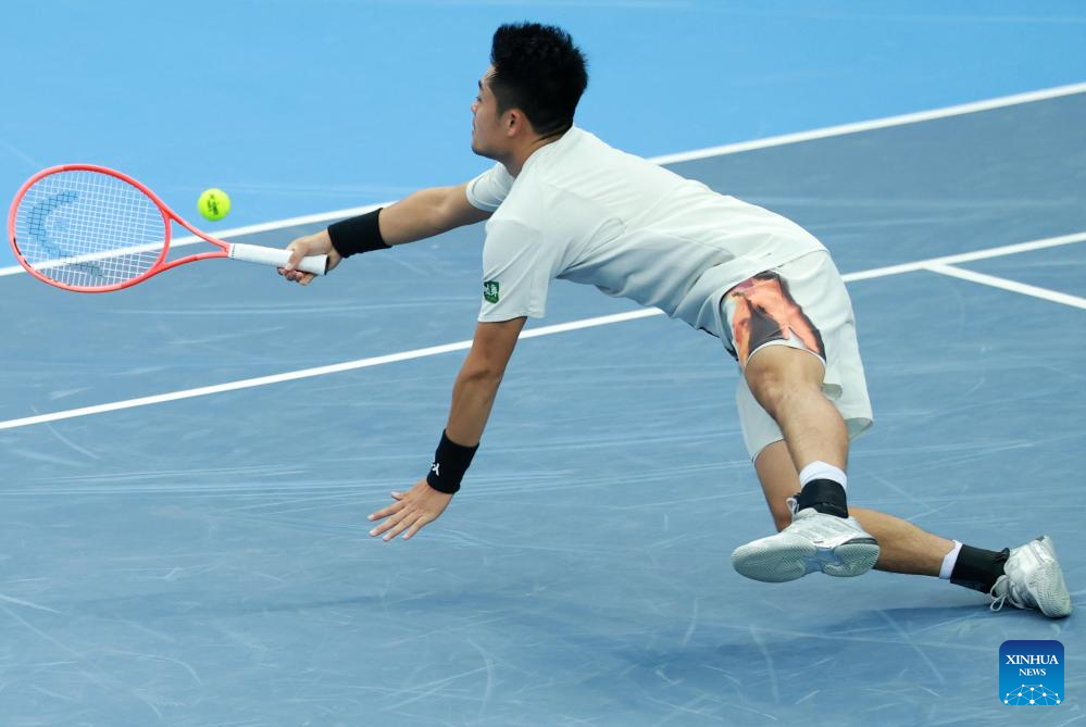Wu Yibing saves the ball during the men's singles semifinal match of tennis between Wu Yibing of Zhejiang and Coleman Wong Chak Lam of Hong Kong at China's 15th National Games in Hengqin, south China's Guangdong Province, Nov. 19, 2025. (Xinhua/Zhang Chenlin)