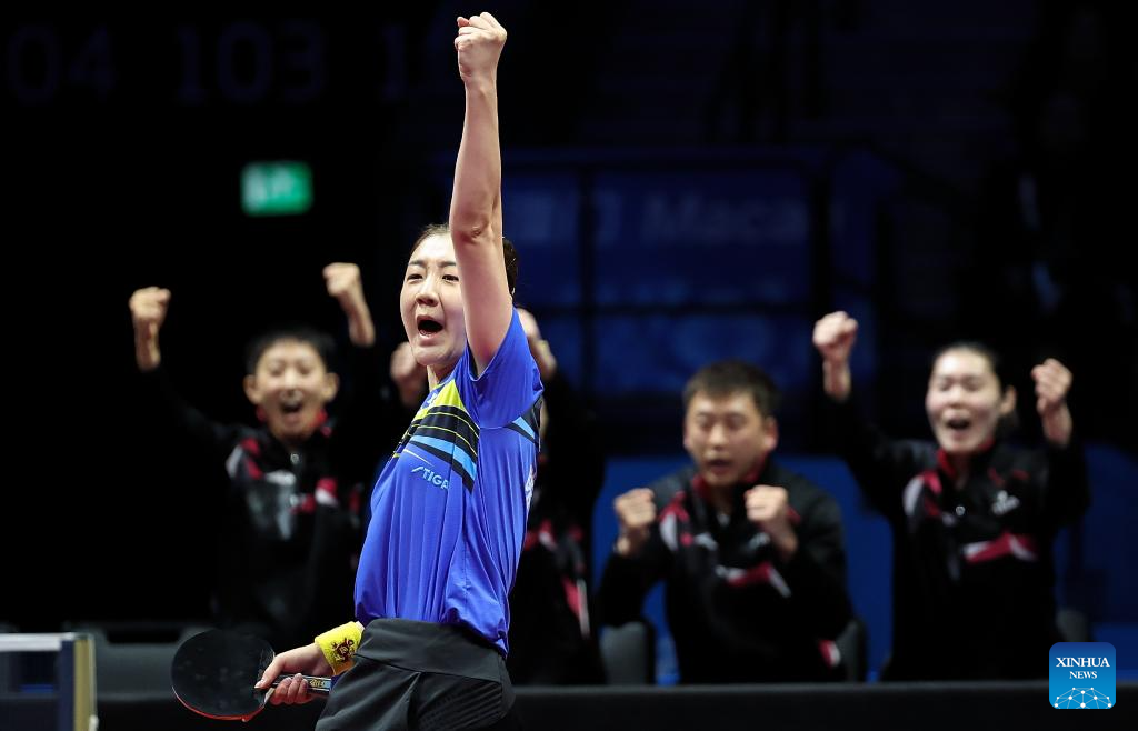 Chen Meng of Shandong reacts in the match against Wang Tianyi of Hebei during the third match of women's team final of table tennis between Hebei and Shandong at China's 15th National Games in Macao, south China, Nov. 19, 2025. (Xinhua/Liang Xu)