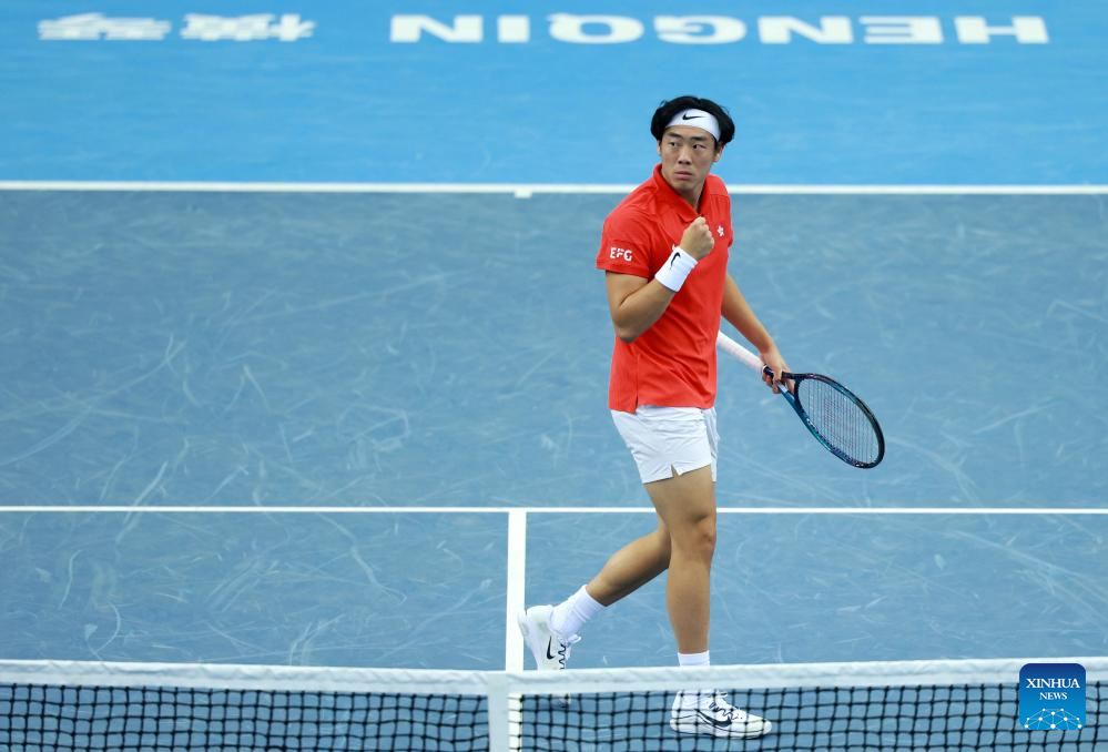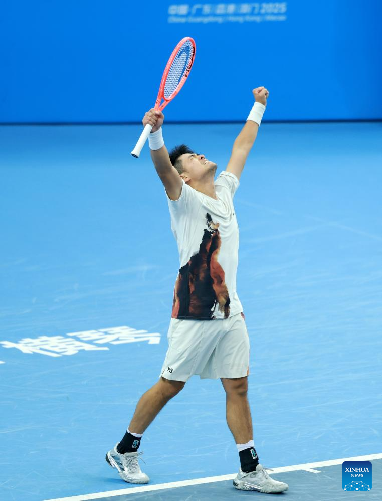 Wu Yibing celebrates winning during the men's singles semifinal match of tennis between Wu Yibing of Zhejiang and Coleman Wong Chak Lam of Hong Kong at China's 15th National Games in Hengqin, south China's Guangdong Province, Nov. 19, 2025. (Xinhua/Zhang Chenlin)
