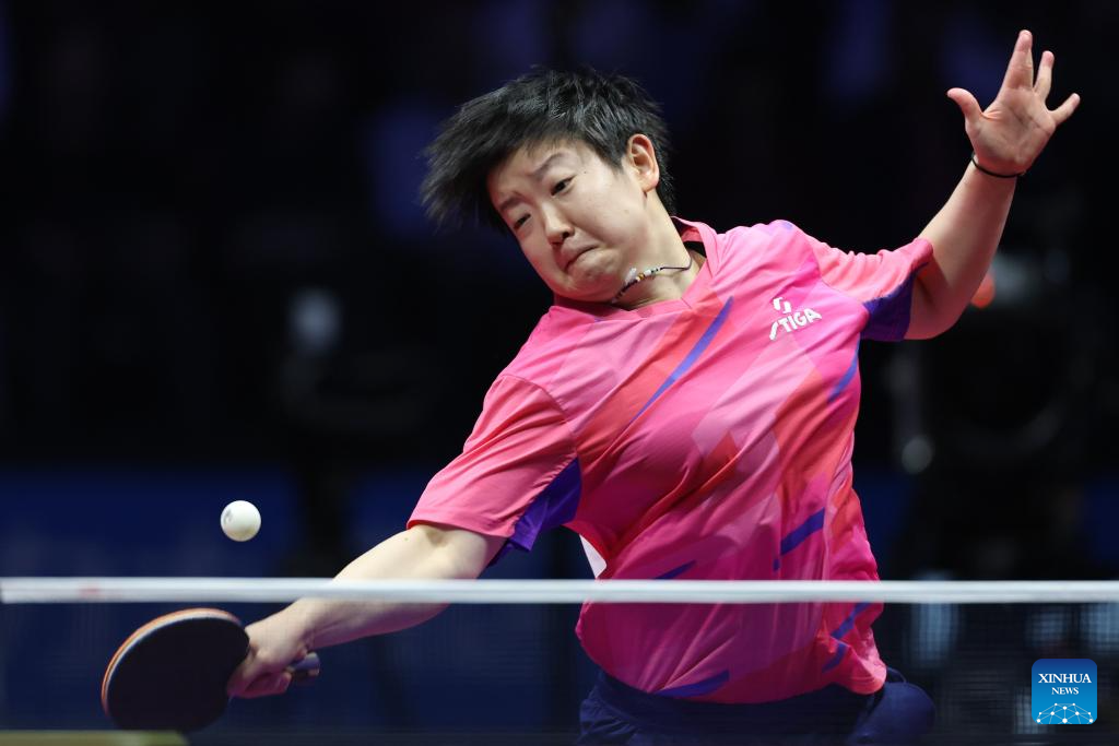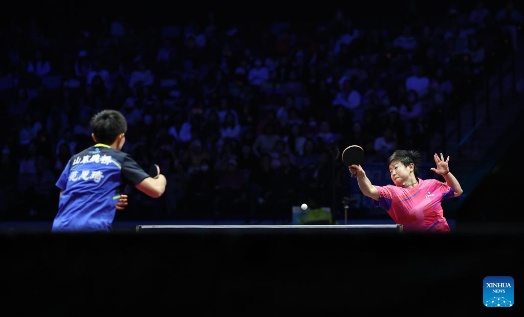 Sun Yingsha of Hebei hits a return in the match against Wang Xiaotong of Shandong during the fourth match of women's team final of table tennis between Hebei and Shandong at China's 15th National Games in Macao, south China, Nov. 19, 2025. (Xinhua/Liang Xu)