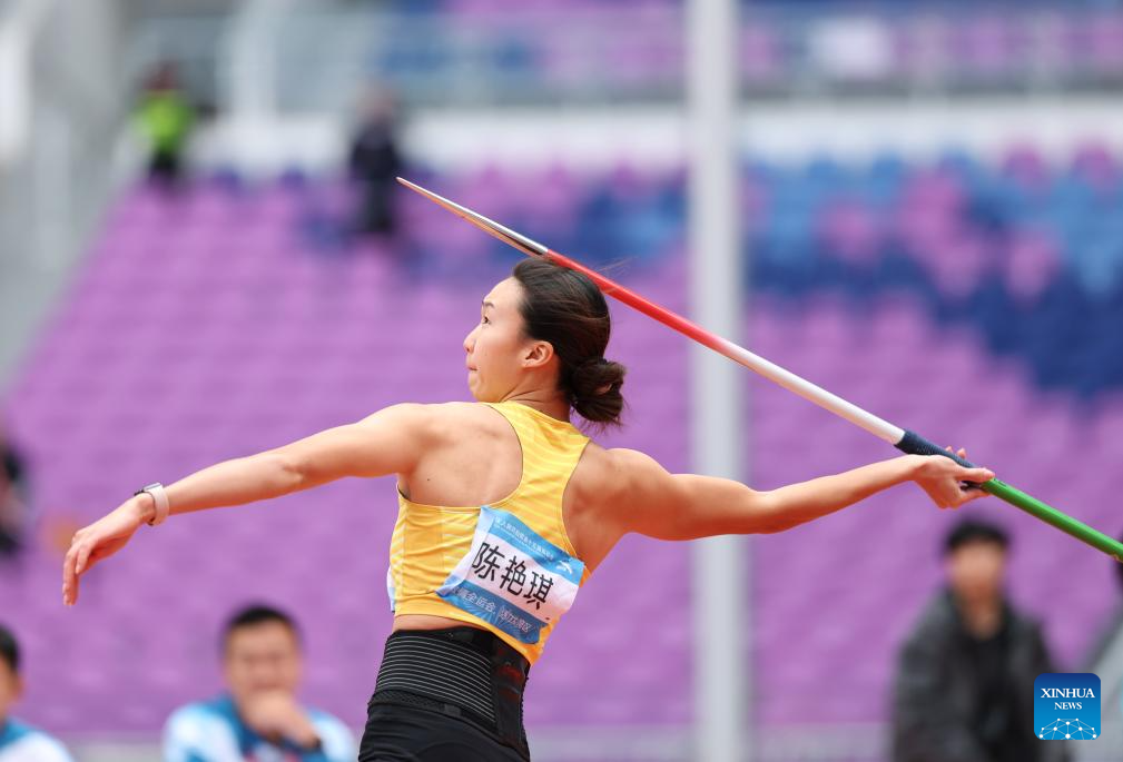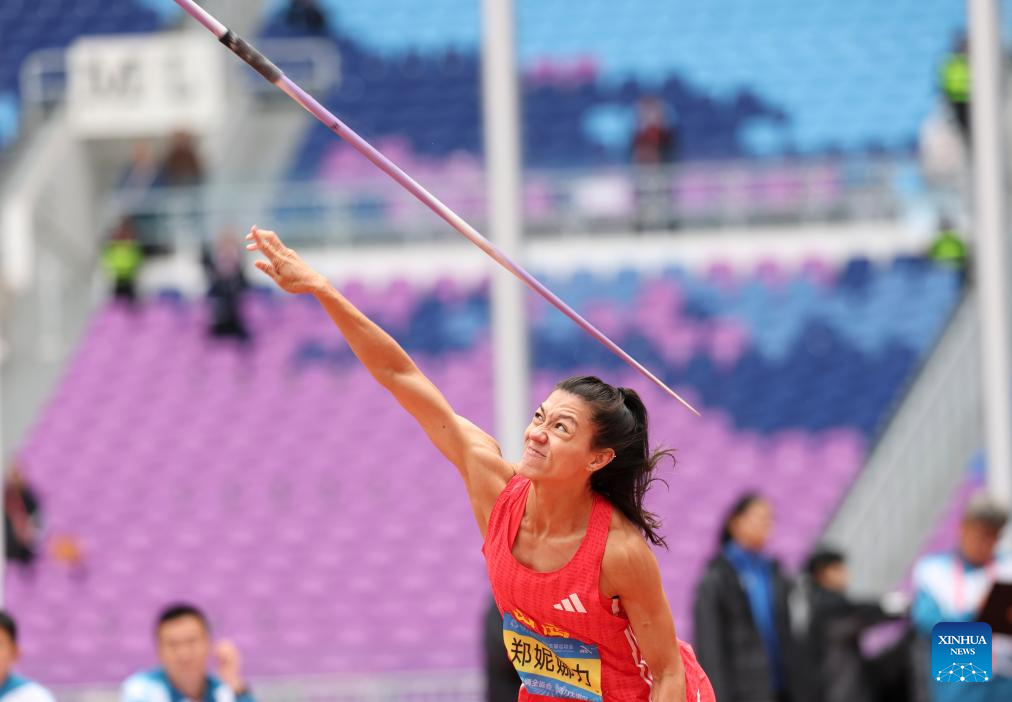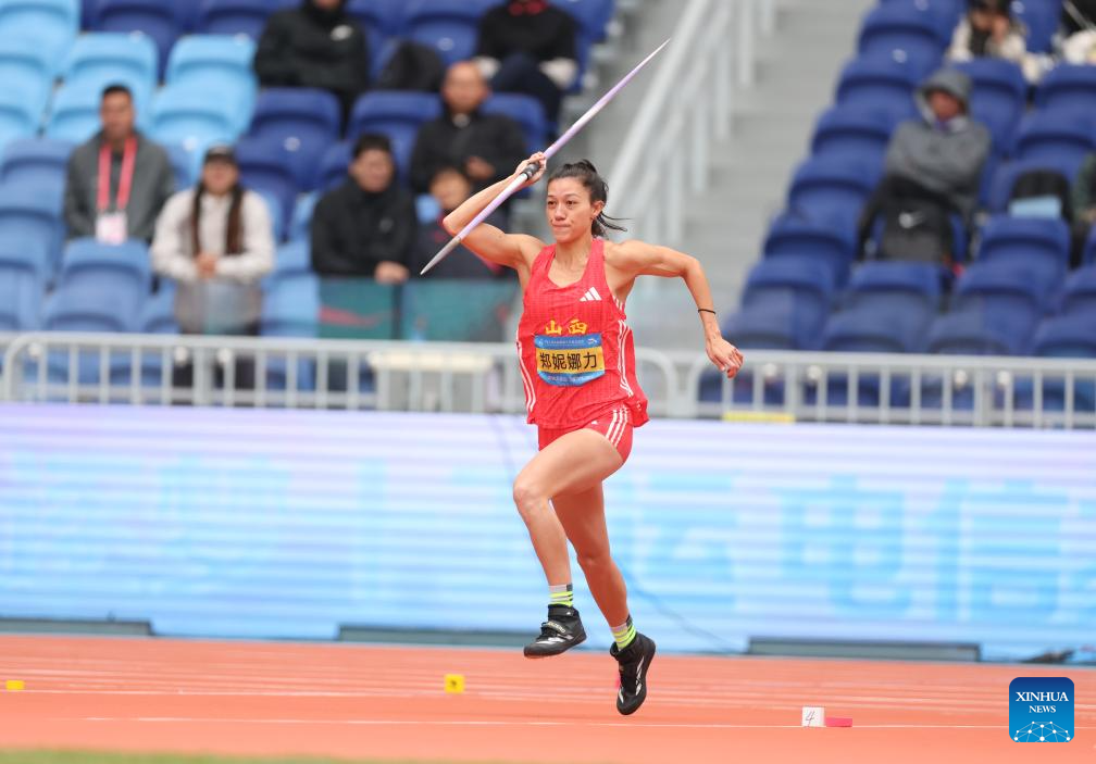 Zheng Ninali of Shanxi competes during the women's heptathlon javelin throw of athletics at China's 15th National Games in Guangzhou, south China's Guangdong Province, Nov. 19, 2025. (Xinhua/Huang Wei)