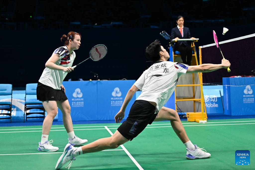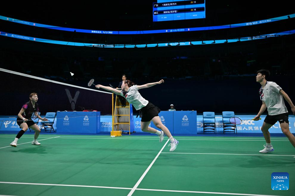 Gao Jiaxuan (front)/Chen Fanghui compete during the mixed doubles bronze medal match of badminton between Guo Xinwa/Wu Mengying of Zhejiang and Gao Jiaxuan/Chen Fanghui of Guangdong at China's 15th National Games in Shenzhen, south China's Guangdong Province, Nov. 19, 2025. (Xinhua/Li Zhipeng)