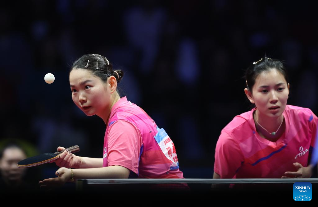He Zhuojia (L) of Hebei serves in the match against Chen Meng and Wang Xiaotong of Shandong during the first match of women's team final of table tennis between Hebei and Shandong at China's 15th National Games in Macao, south China, Nov. 19, 2025. (Xinhua/Liu Xu)