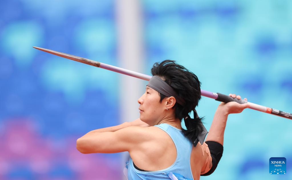 Wu Zheng of Jiangxi competes during the women's heptathlon javelin throw of athletics at China's 15th National Games in Guangzhou, south China's Guangdong Province, Nov. 19, 2025. (Xinhua/Huang Wei)