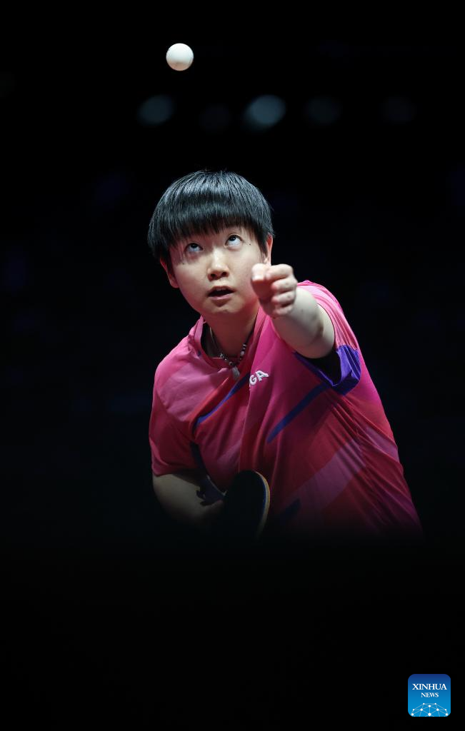 Sun Yingsha of Hebei serves in the match against Wang Xiaotong of Shandong during the fourth match of women's team final of table tennis between Hebei and Shandong at China's 15th National Games in Macao, south China, Nov. 19, 2025. (Xinhua/Liang Xu)