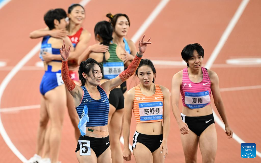 Chen Yujie (C front) of Zhejiang and Liu Yinglan (L front)of Sichuan react after the women's 200m final of athletics at China's 15th National Games in Guangzhou, south China's Guangdong Province, Nov. 19, 2025. (Xinhua/Deng Hua)