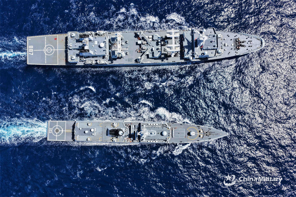 The guided-missile frigate Dali (Hull 553) attached to a Chinese PLA naval base conducts alongside replenishment-at-sea with the comprehensive supply ship Weishanhu (Hull 887) during a comprehensive supply training exercise on November 2, 2025. (eng.chinamil.com.cn/Photo by Cai Shengqiu)