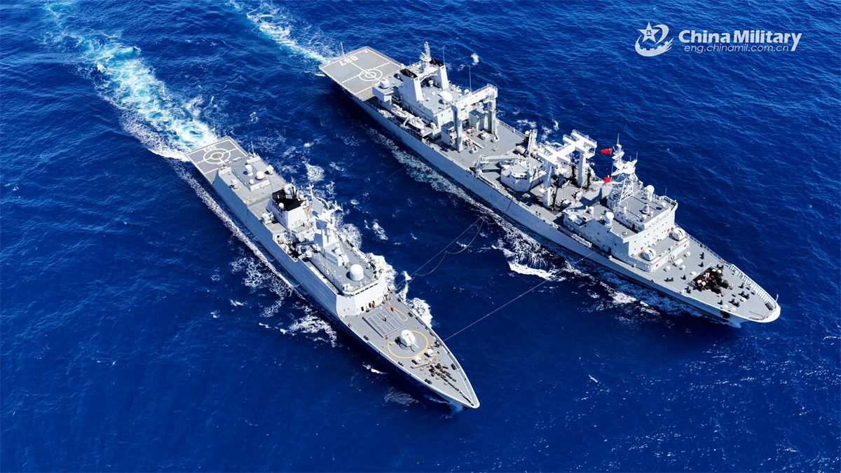 The guided-missile frigate Dali (Hull 553) attached to a Chinese PLA naval base conducts alongside replenishment-at-sea with the comprehensive supply ship Weishanhu (Hull 887) during a comprehensive supply training exercise on November 2, 2025. (eng.chinamil.com.cn/Photo by Cai Shengqiu)