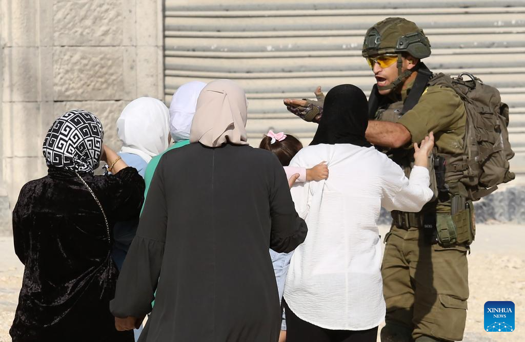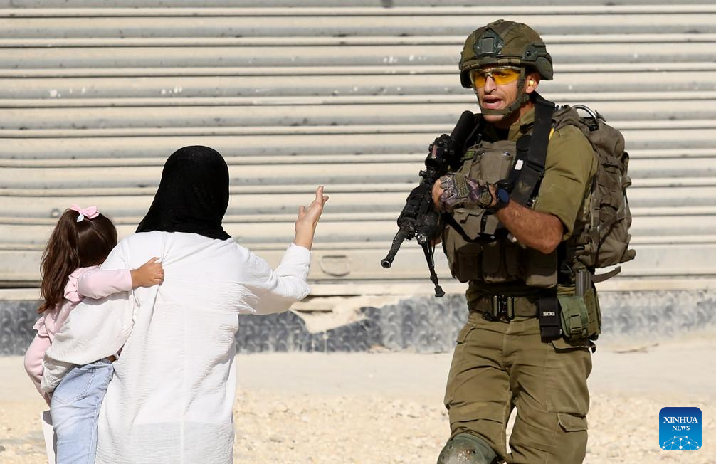 An Israeli soldier tries to prevent Palestinians from reaching their houses in Nur Shams refugee camp in the West Bank city of Tulkarm, Nov. 18, 2025. Palestinians took part in a demonstration demanding the right to return to their houses at the entrance of Nur Shams refugee camp, while Israeli soldiers assaulted the crowd and forced them to leave the area. (Photo by Nidal Eshtayeh/Xinhua)