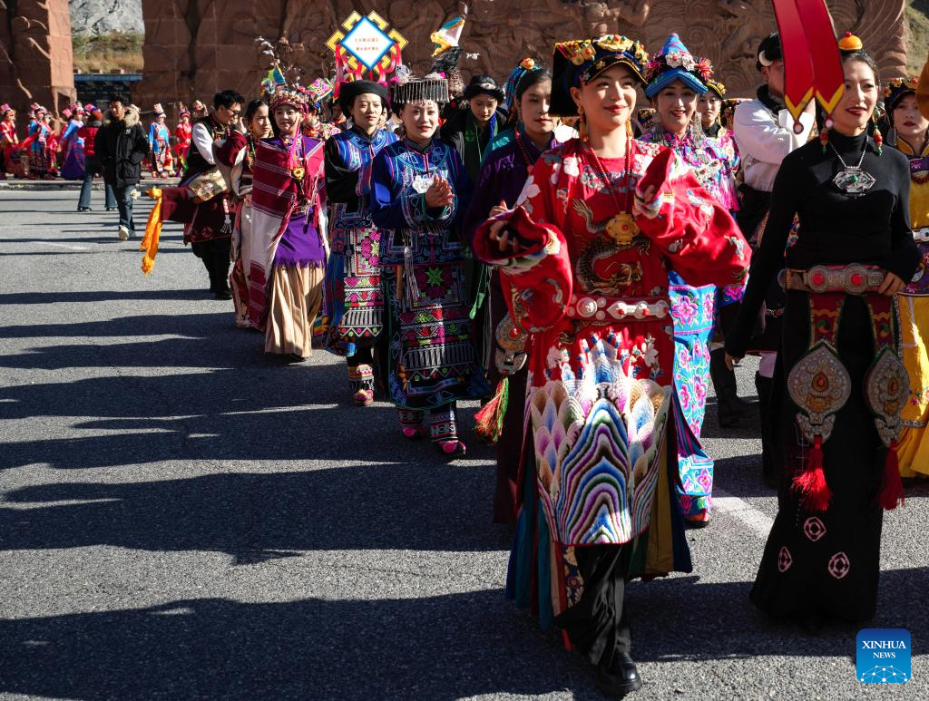 Women in ethnic attire attend an event celebrating the Qiang New Year in Wenchuan County, Aba Tibetan and Qiang Autonomous Prefecture, southwest China's Sichuan Province, Nov. 19, 2025. An event celebrating the Qiang New Year was held here on Wednesday, starting a series of activities to celebrate the Qiang New Year, which falls on Nov. 20 this year. (Photo by Lan Hongguang/Xinhua)