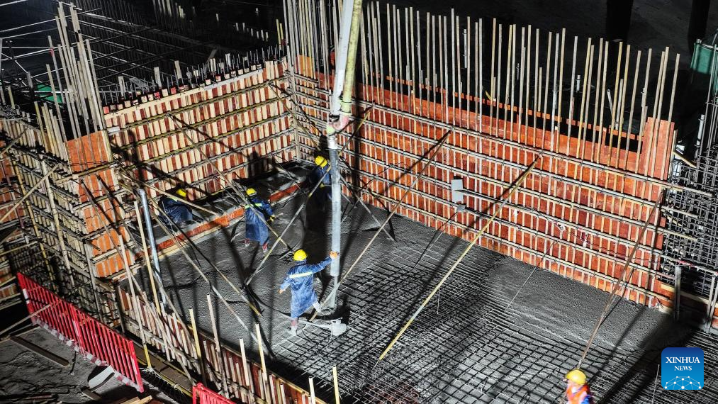 An aerial drone photo taken on Nov. 18, 2025 shows workers working at a construction site of Rongxian South Railway Station in Rongxian County of Yulin City, south China's Guangxi Zhuang Autonomous Region. The Yulin-Cenxi section of the Nanning-Zhuhai high-speed railway is under intense construction at present, aiming to open to traffic in 2026. (Xinhua/Zhang Ailin)