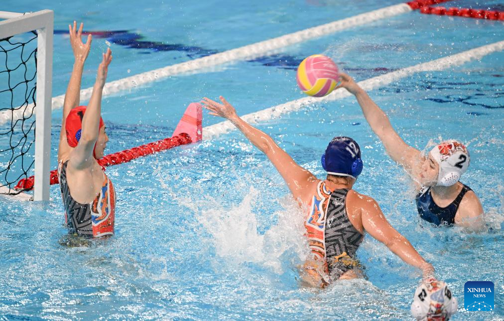 Wang Huan (2nd R) of Shanghai celebrates during the women's water polo final between Shanghai and Tianjin at China's 15th National Games in Guangzhou, south China's Guangdong Province, Nov. 21, 2025. (Xinhua/Pan Yulong)