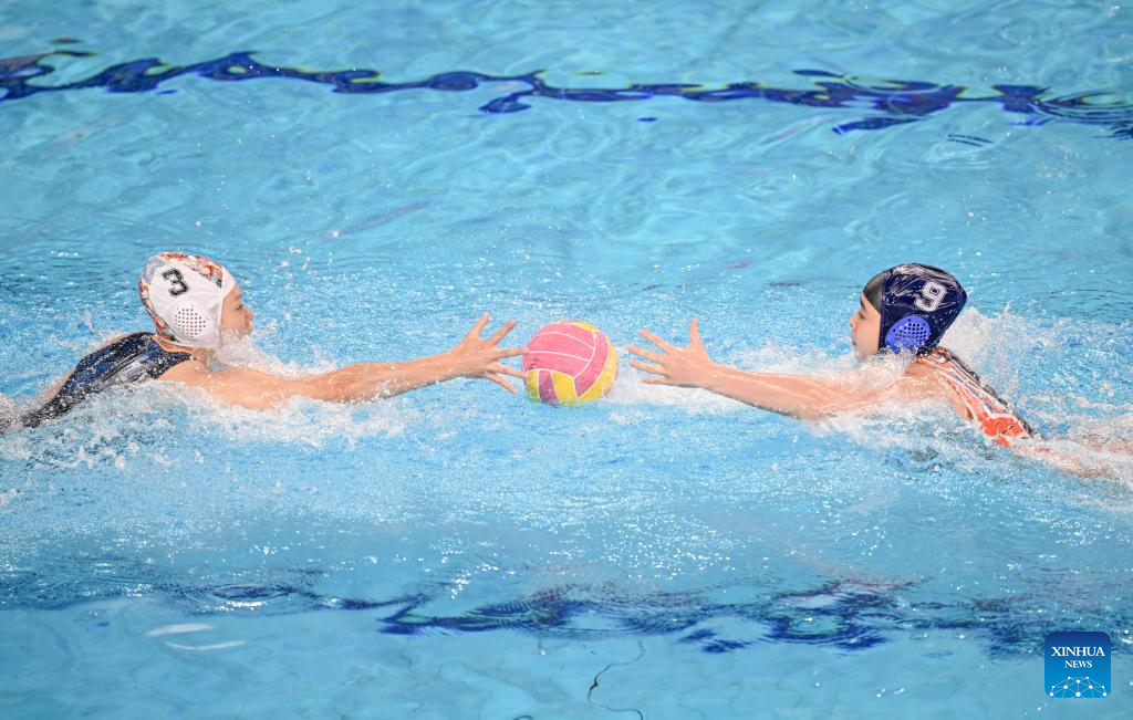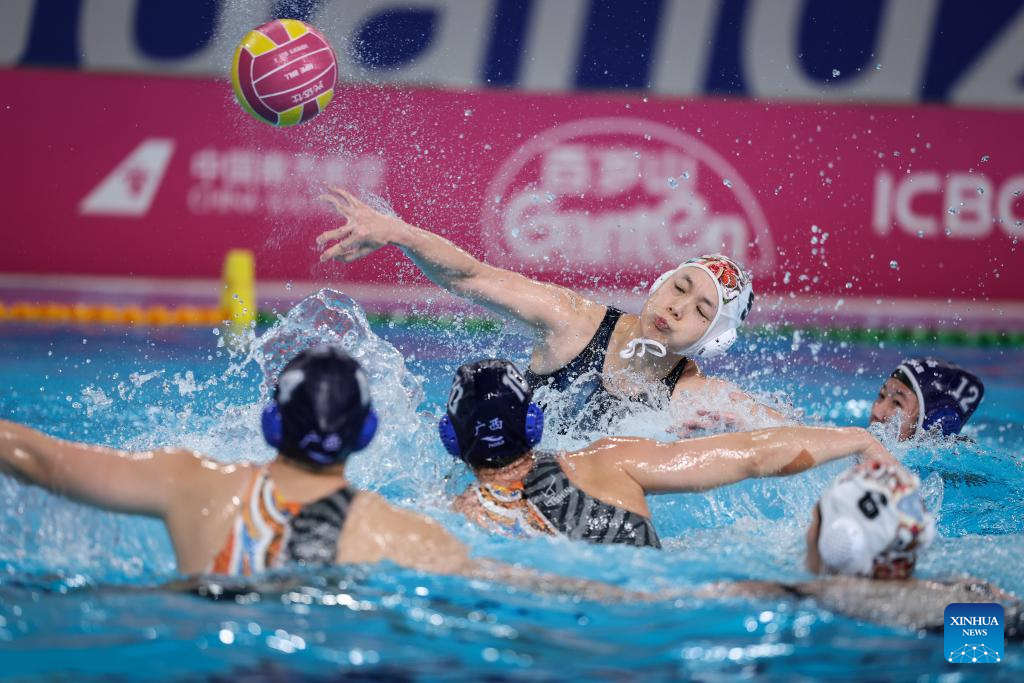 Wang Huan (R) of Shanghai competes during the women's water polo final between Shanghai and Tianjin at China's 15th National Games in Guangzhou, south China's Guangdong Province, Nov. 21, 2025. (Xinhua/Pan Yulong)