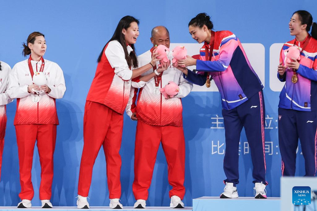 Gold medalists team Shanghai (C), silver medalists team Tianjin (L), bronze medalists team Guangxi react during the awarding ceremony for the women's water polo at China's 15th National Games in Guangzhou, south China's Guangdong Province, Nov. 21, 2025. (Xinhua/Pan Yulong)