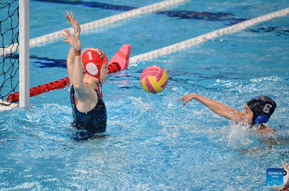 Goalkeeper Shen Yineng (R) of Shanghai competes during the women's water polo final between Shanghai and Tianjin at China's 15th National Games in Guangzhou, south China's Guangdong Province, Nov. 21, 2025. (Xinhua/Pan Yulong)