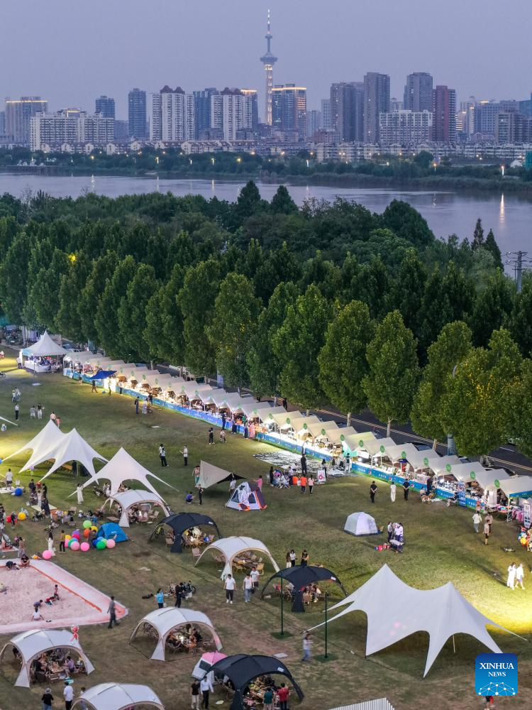 An aerial drone photo shows people enjoying their leisure time in Jiangxinzhou island of Nanjing, east China's Jiangsu Province, Oct. 1, 2025.