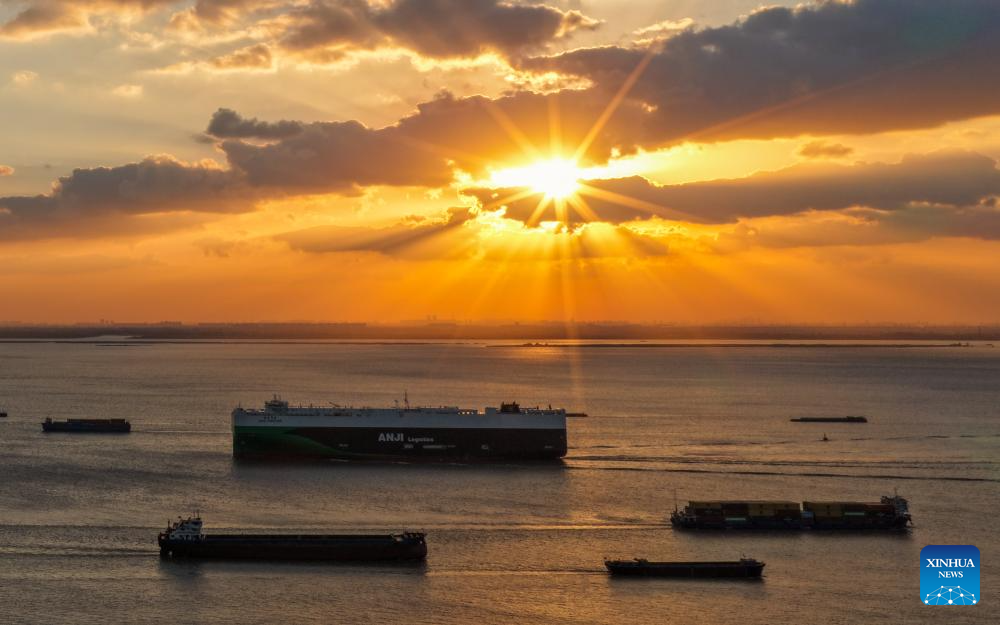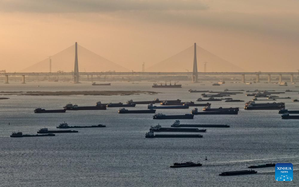 An aerial drone photo shows vessels sailing along the Yangtze River in Nantong, east China's Jiangsu Province, Oct. 23, 2025.