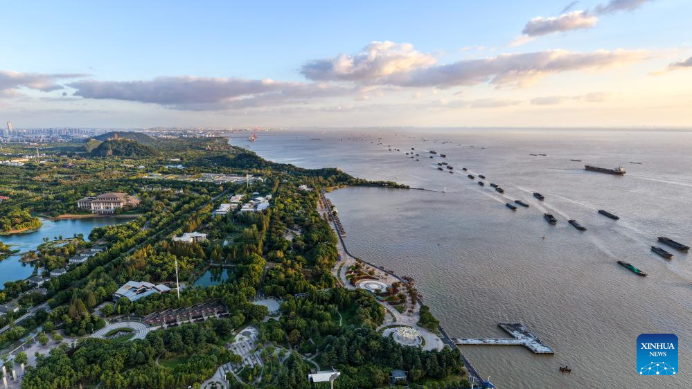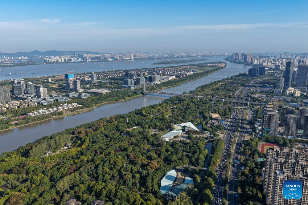 An aerial drone photo shows a view of the Langshan national forest park along the Yangtze River in Nantong City, east China's Jiangsu Province, Oct. 23, 2025.