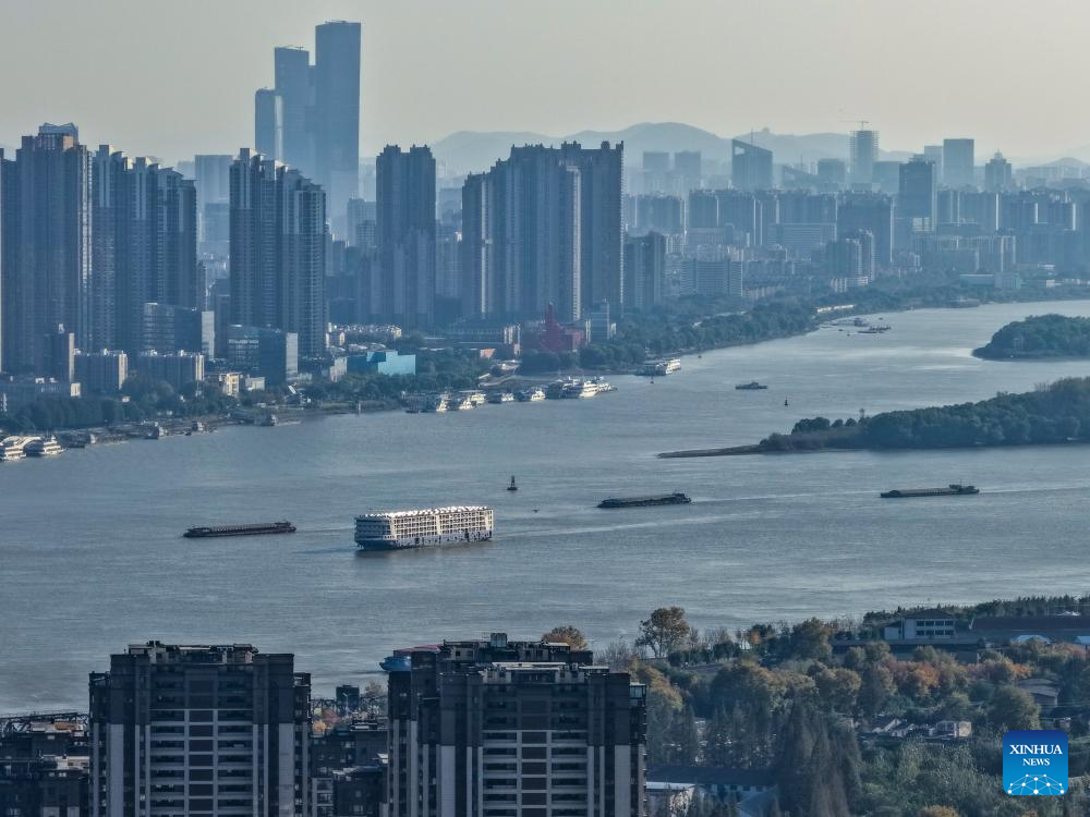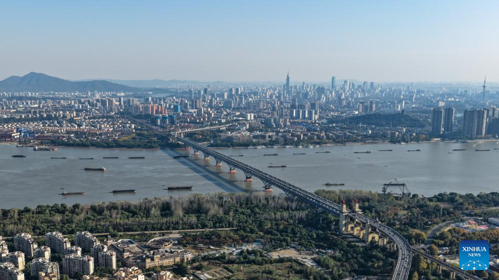 An aerial drone photo shows a section of the Yangtze River in Nanjing, east China's Jiangsu Province, Nov. 18, 2025.