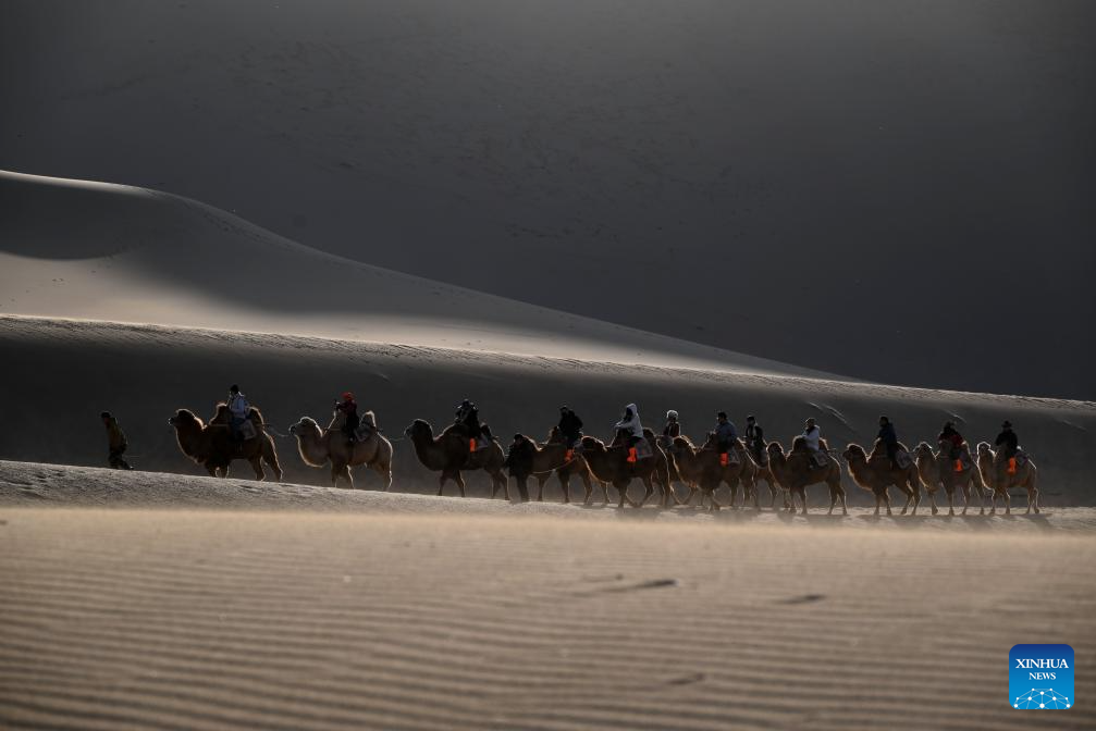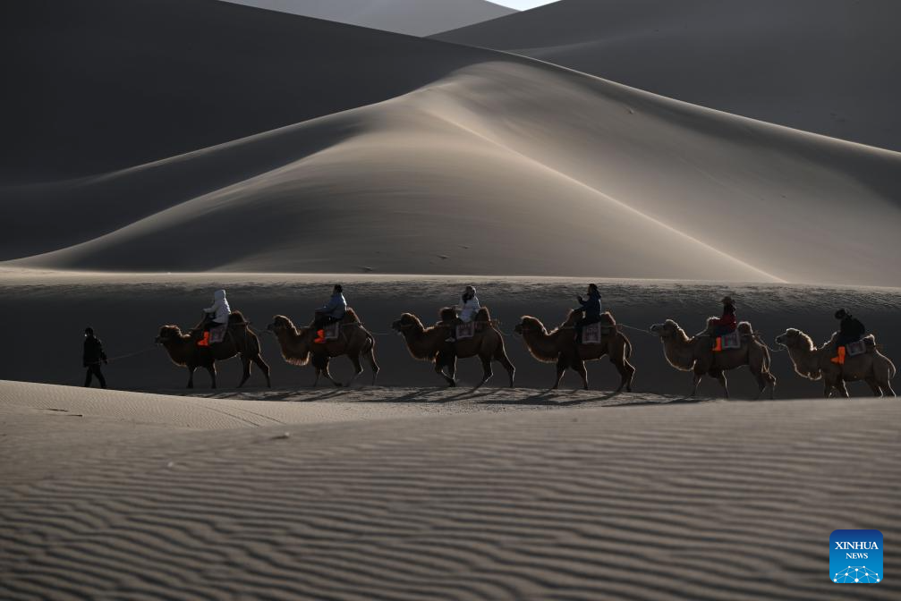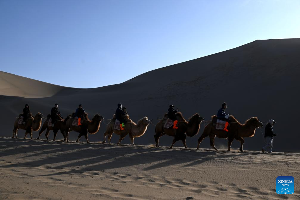 Tourists visit the Mingsha Mountain and Crescent Spring Scenic Area in Dunhuang City, northwest China's Gansu Province, on Nov. 22, 2025. (Photo by Zhang Xiaoliang/Xinhua)