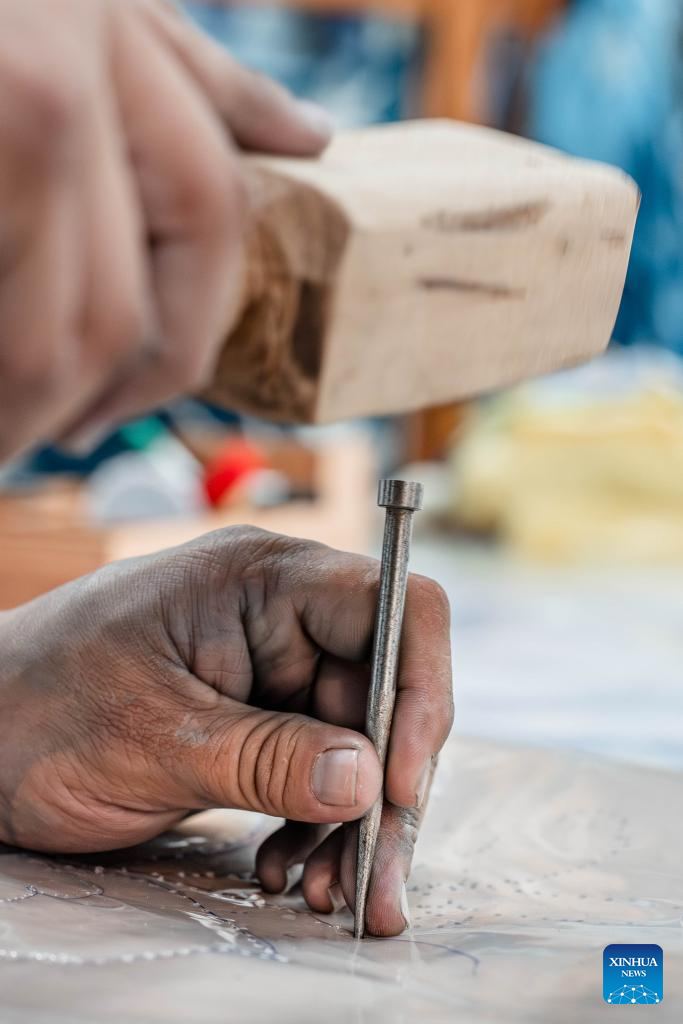 Duan Yuan, an inheritor of the tie-dye technique of Bai ethnic group, makes tie-dye designs in a dyehouse in Zhoucheng Village of Dali Bai Autonomous Prefecture, southwest China's Yunnan Province, Nov. 21, 2025. (Xinhua/Hu Chao)