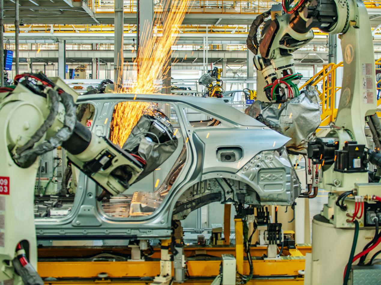 Robotic arms weld frames of new energy vehicles in an automated workshop of Chinese carmaker Chang'an Automobile in Nanjing, east China's Jiangsu province. (Photo/Zhu Hongsheng)