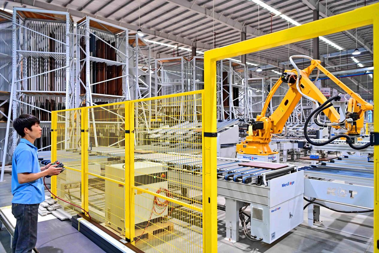 An engineer controls a robotic arm to cut furniture boards in a smart workshop of a furniture company in Ganzhou, east China's Jiangxi province. (Photo/Zhu Haipeng)