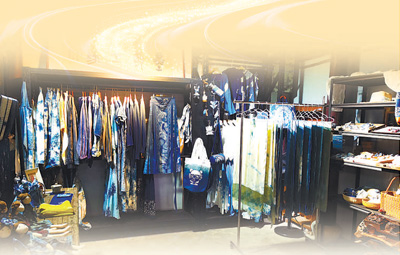On a sunny winter day, visitors flock to Dachen village in Qiancang town, Yongkang. At a natural dye workshop, blue fabrics flutter in the drying area. Inside the display room, various products, such as horse-faced skirts, shirts and scarves, attract attention, while everyday items like cushions and umbrellas are also on display.