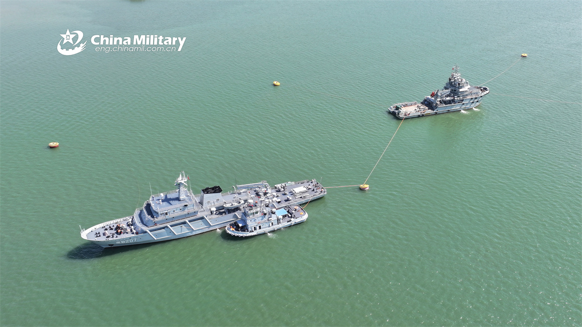 Degaussing ship Nanqin 207 (front) attached to aflotilla with the navy of Chinese PLA conducts magnetic risk management for another ship (rear) under the help of a tugboat on November 12, 2025. (eng.chinamil.com.cn/Photo by Jiang Mengda)